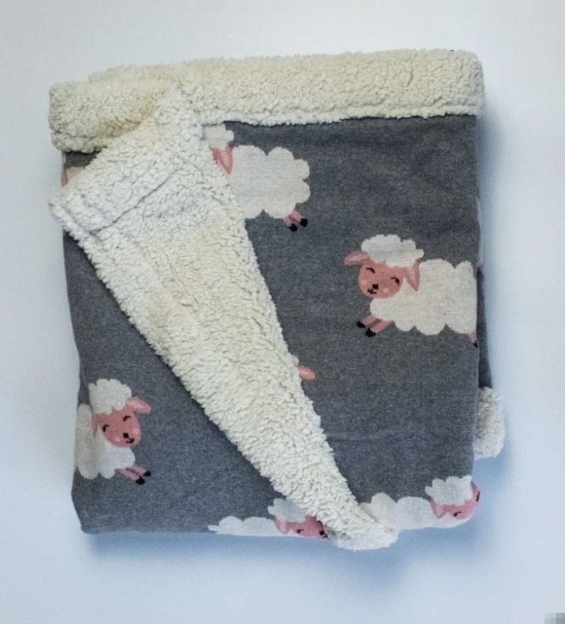 • Κουβέρτα κούνιας 1,00*1,20 βαμβάκι 100%πλεκτό με σχέδιο προβατάκι σε γκρι φόντο με πίσω όψη  sherpa όψη προβατάκι