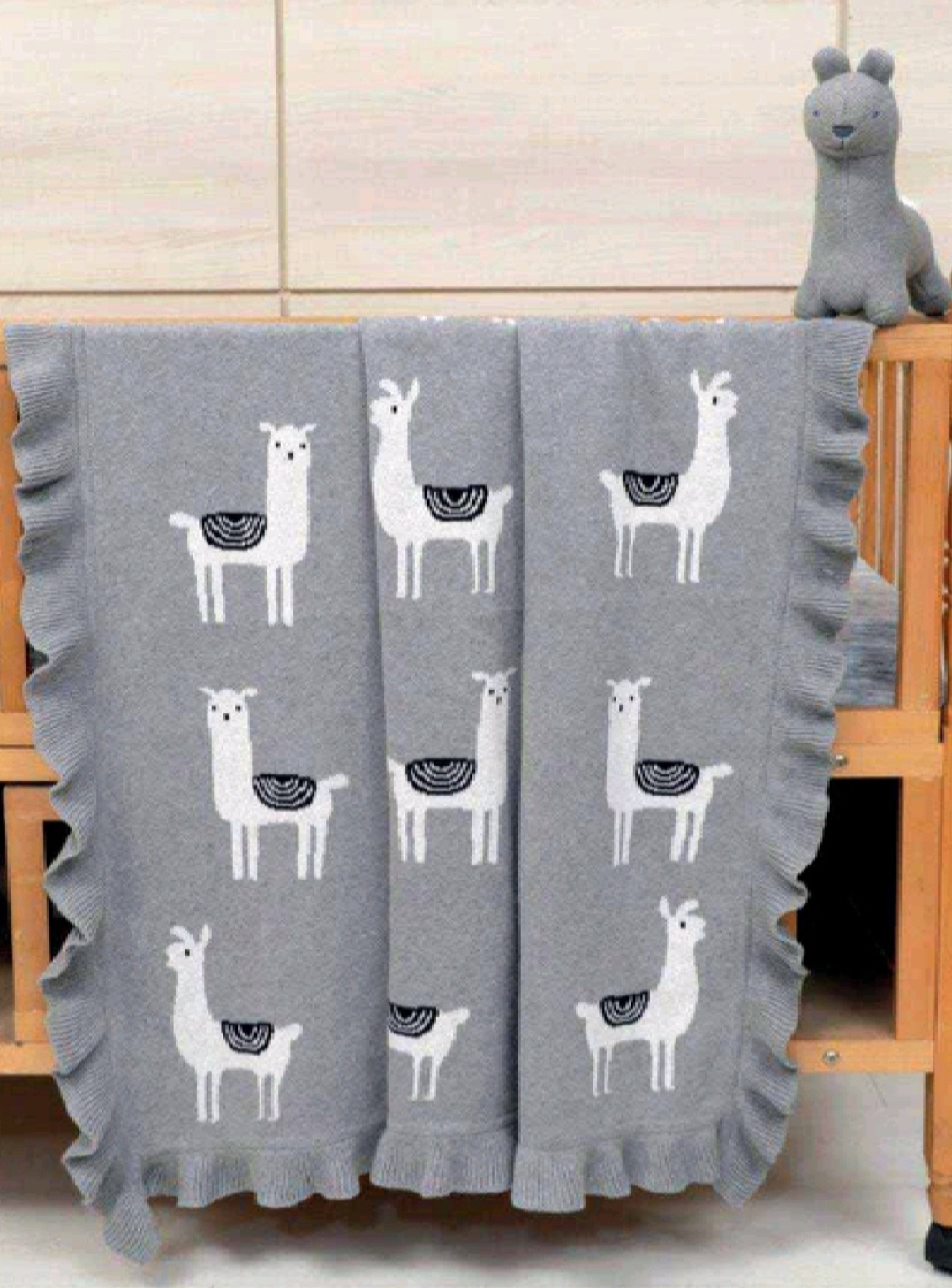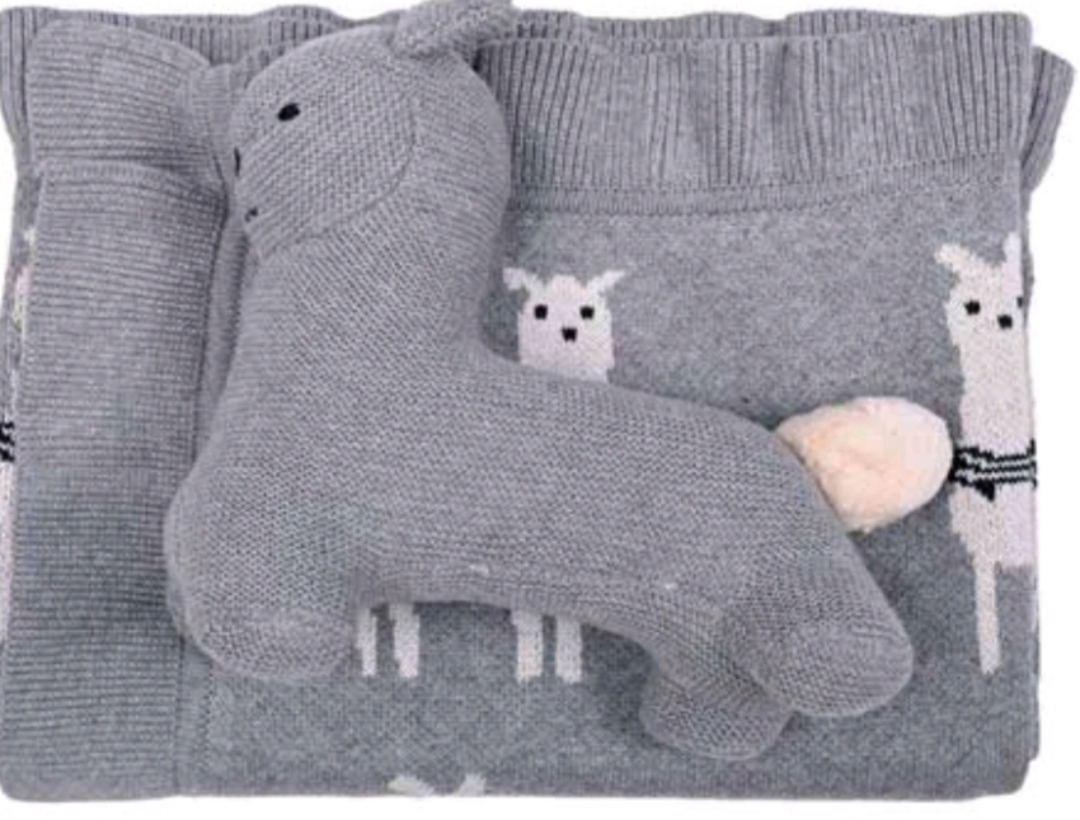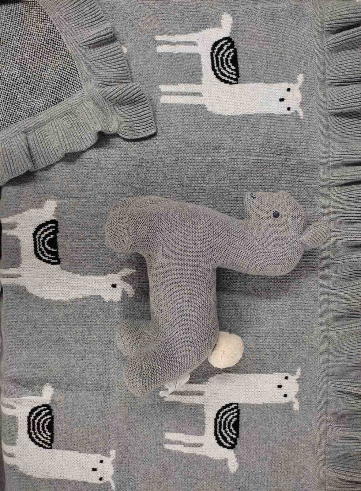 Σετ κουβερτάκι κούνιας 100*120 βαμβάκι100% σε γκρι χρώμα με σχέδιο λάμα και παιχνίδι πλεχτό ζωάκι λάμα