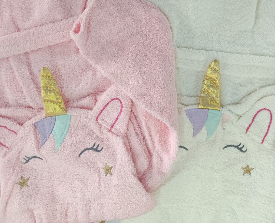 Μπουρνούζι βαμβακερό με κουκούλα σχέδιο Μονόκερος για ηλικίες 1-2, 2-3,3-4 σε ροζ και λευκό
