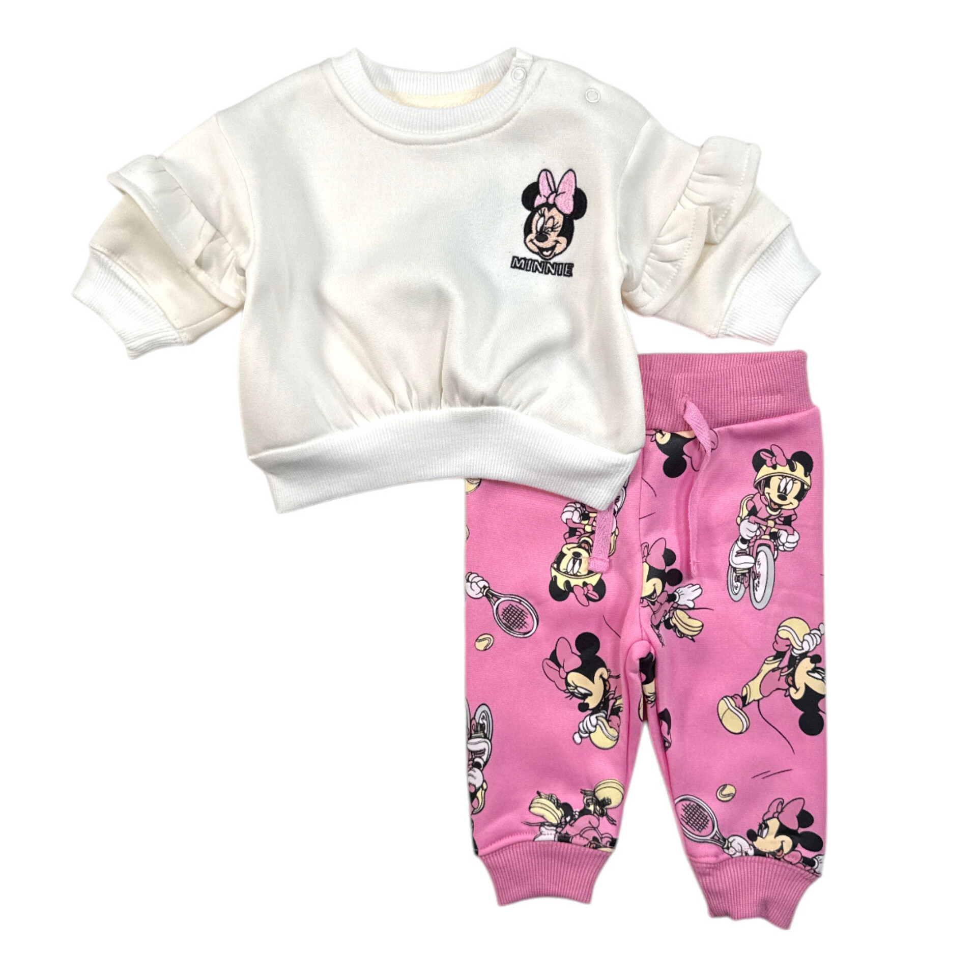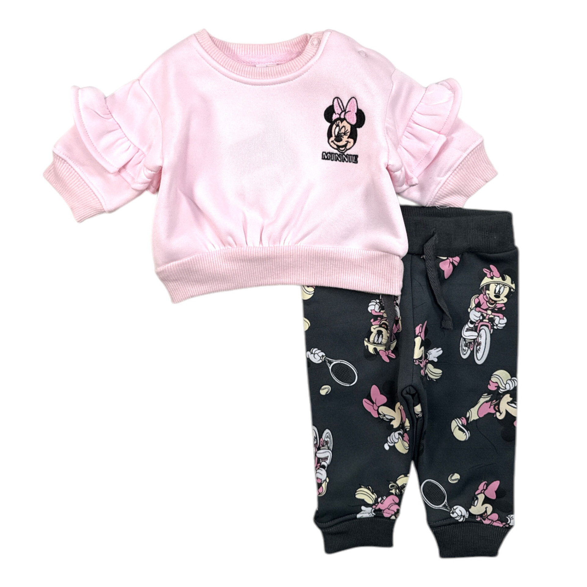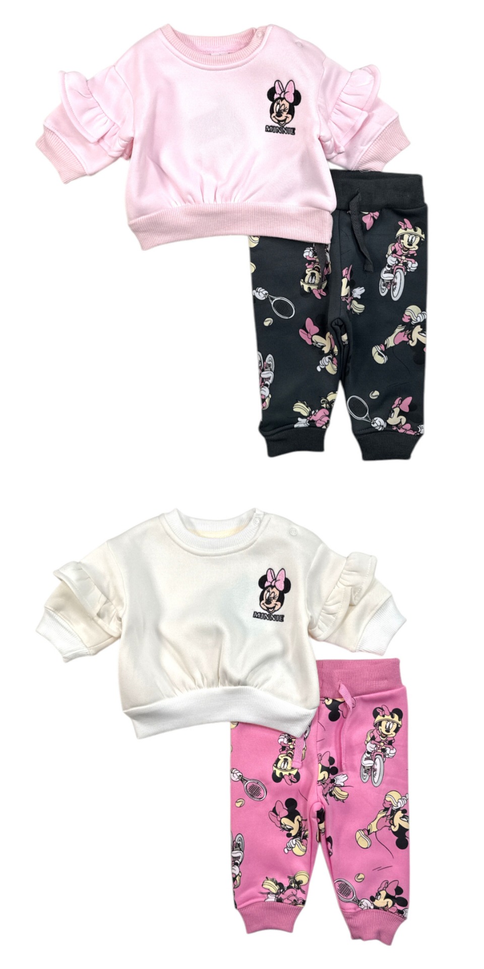 Βρεφικό σετ ρούχα Disney Minnie Mouse σε δυο παραλλαγές χρωμάτων. Φούτερ μπλούζα με κέντημα Minnie και βολάν στα μανίκια. Εμπριμέ παντελόνι φούτερ